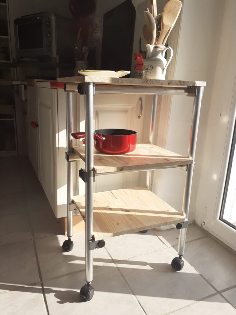 Et pour le plateau : Une planche de bois ( MDF, contreplaqué ou bois massif) verre ou métal aux dimensions désirées. Le fixer avec des vis adaptées ou des supports adaptés.